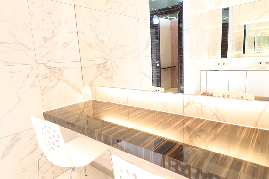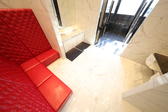 そして、禁断の女子トイレは、開放感のあるパウダースペースに、ルージュのような真っ赤な革張りのソファーが。