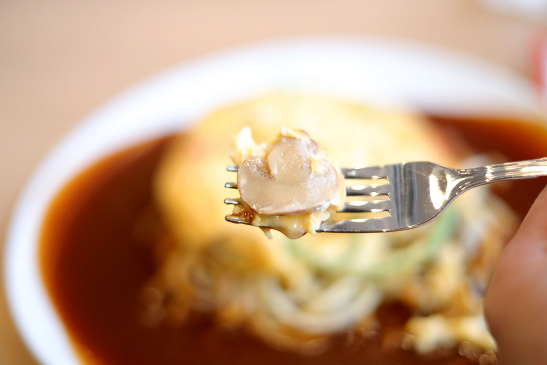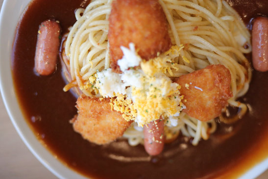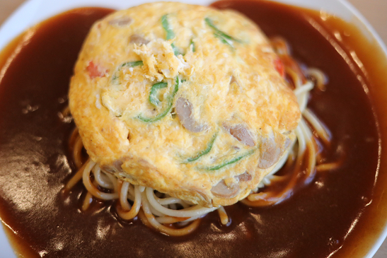 太めの麺、濃い味付けのあん、さらにボリューム満点のトッピングで食欲をそそるスパゲッティ。