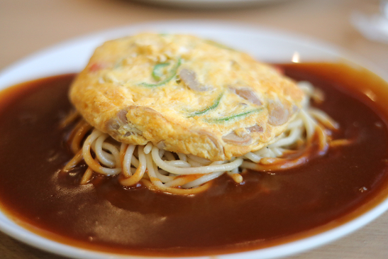 筆者は、撮影で動き回るので、イタリアンオムレツのせの「ナポリ」を、ちなみにカトケンはチキンカツ・ウィンナーのせでボリューム満点、1番人気の「バイキング」を発注。