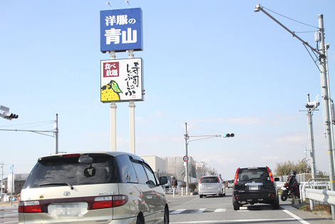 側道を進み一つ目の信号「洋服の青山」看板を右折。ニトリを正面左に眺め、その信号を右折。側道を小束6交差点方面に戻ると左手にオーギヤが現れる