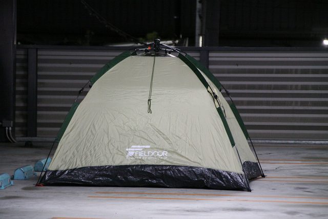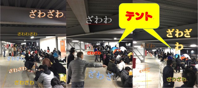 立体駐車場にはテントガ張ってあり、シートを置いて寝ているファンの姿が、あっちにもこっちにも。