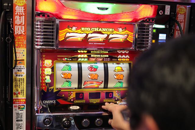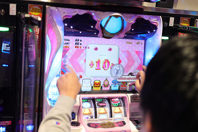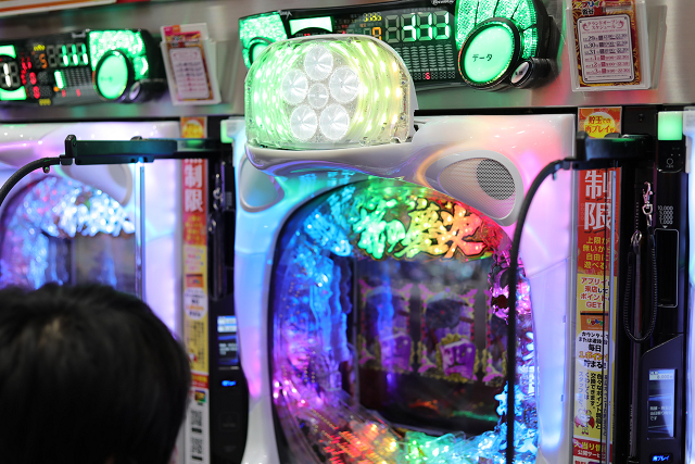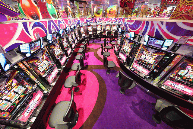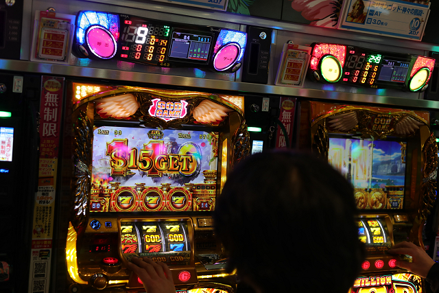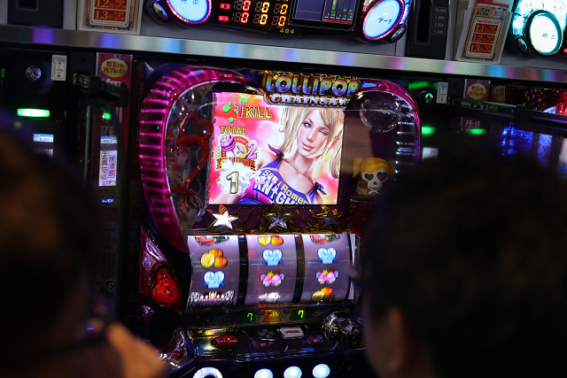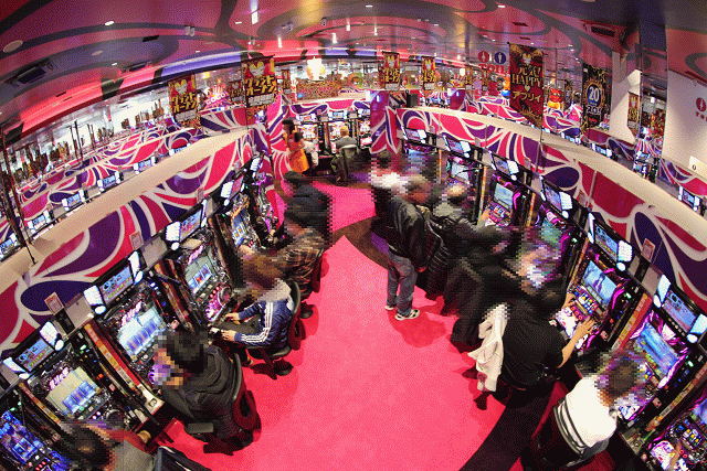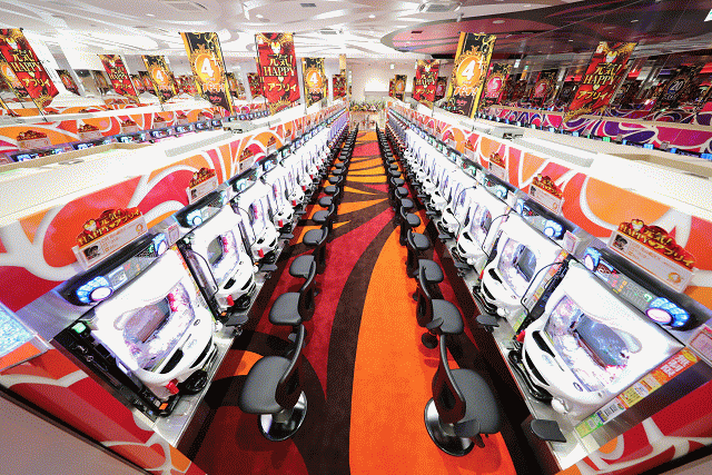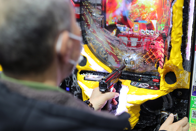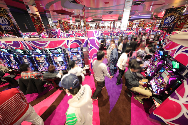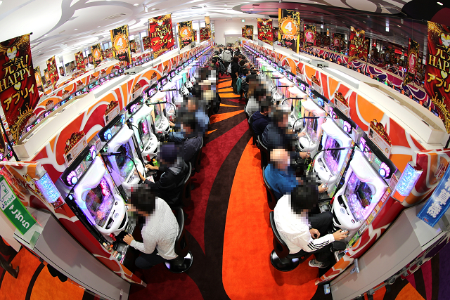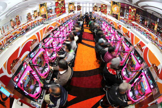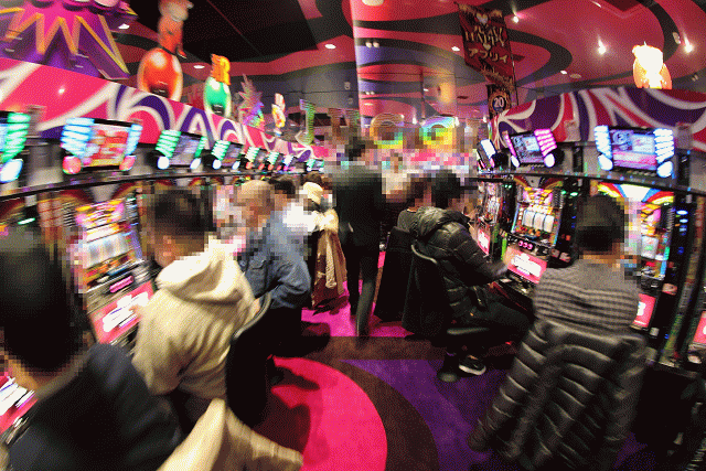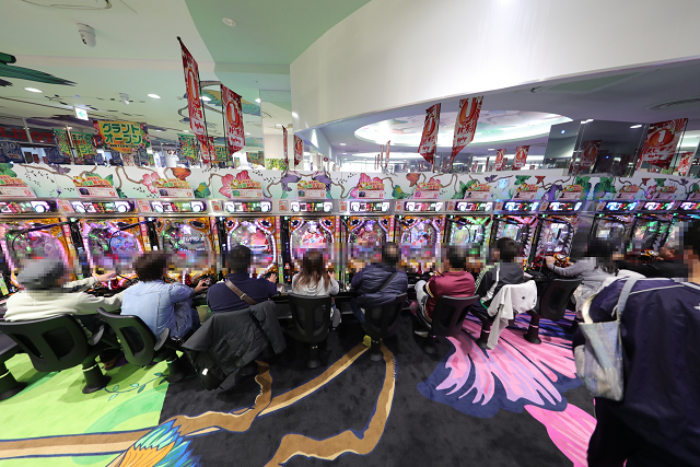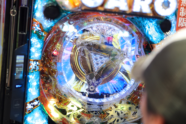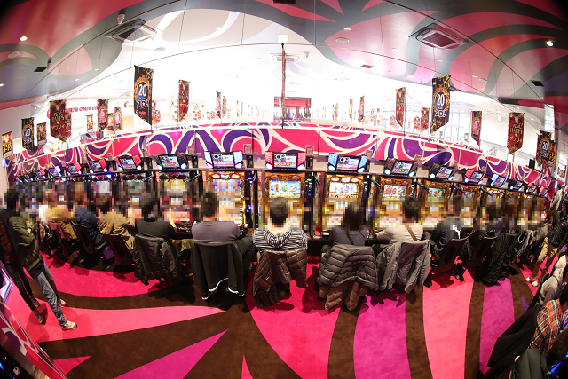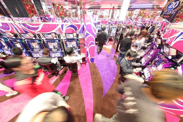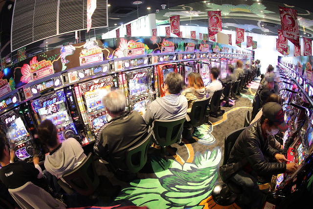 一斉にレバーオンのパチスロコーナー、ハンドルを握るパチンココーナー。