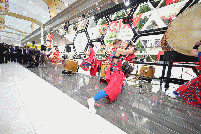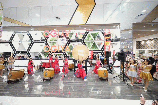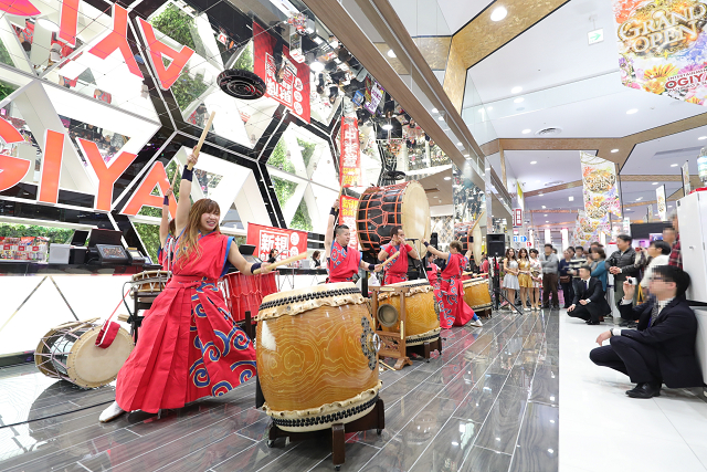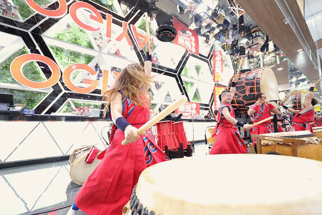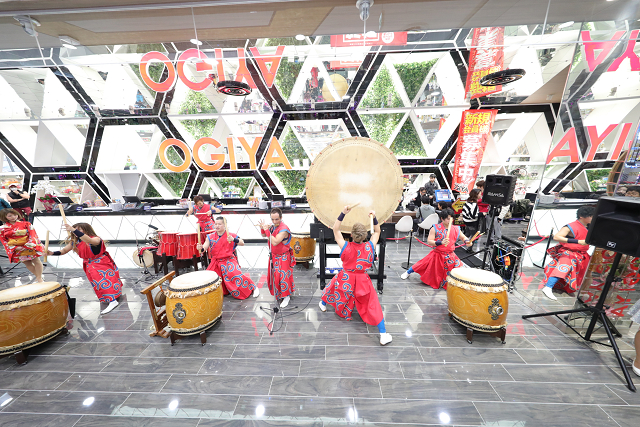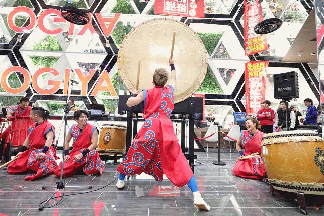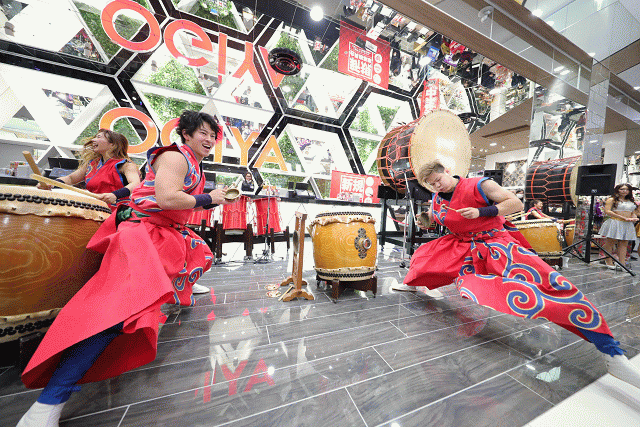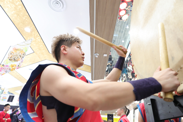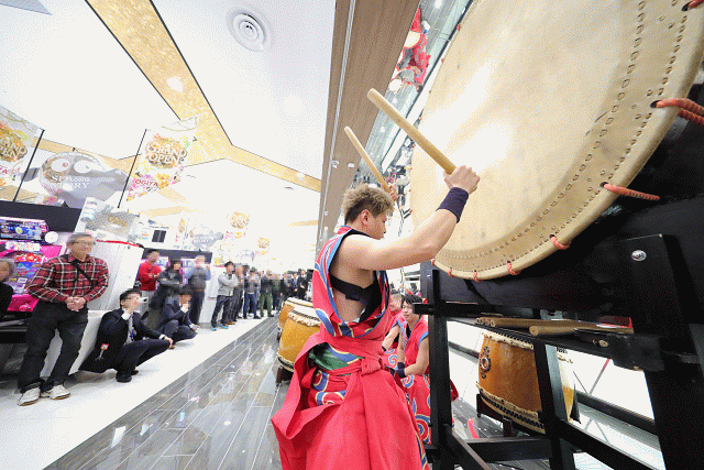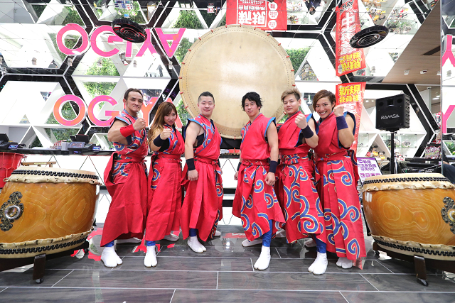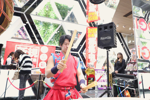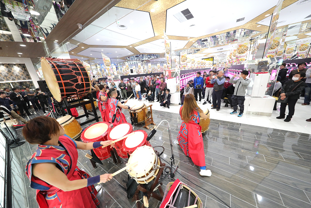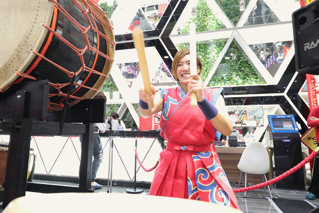 入場開始と時を同じくして、中央の賞品カウンター前では大阪を拠点に数々の音楽イベントで名を馳せる『倭太鼓飛龍(わだいこひりゅう)』のメンバーが、演奏を開始。