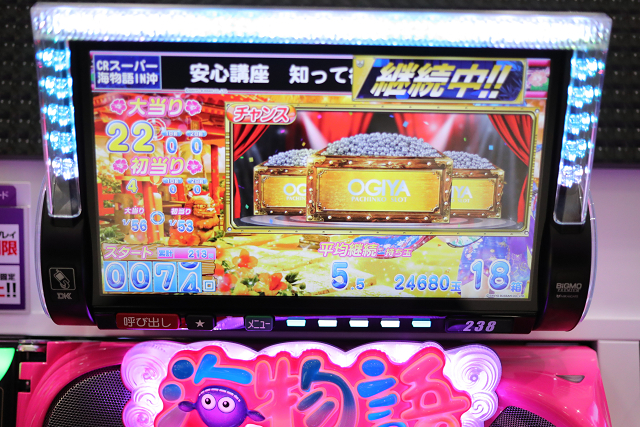 大人気の『海物語』シリーズも『CRスーパー海物語IN沖縄4マリンシェルビビッドピンクバージョン』80台『CRスーパー海物語IN JAPAN 319バージョン』40台、『CRAスーパー海物語 IN JAPAN with 桃太郎電鉄』40台、合計160台でマリンちゃんが「おめでとう」を連呼。