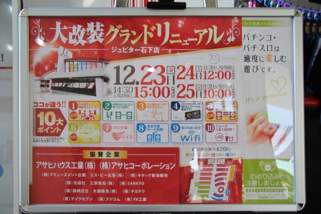 ではここで、『パーラージュピター石下店』がファンの声に真剣に耳を傾け、ファンの立場に立って大改装したグランドリニューアルポイントを再び説明。