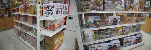 玩具やパチグッズに家電製品まで色とりどりの品の数。