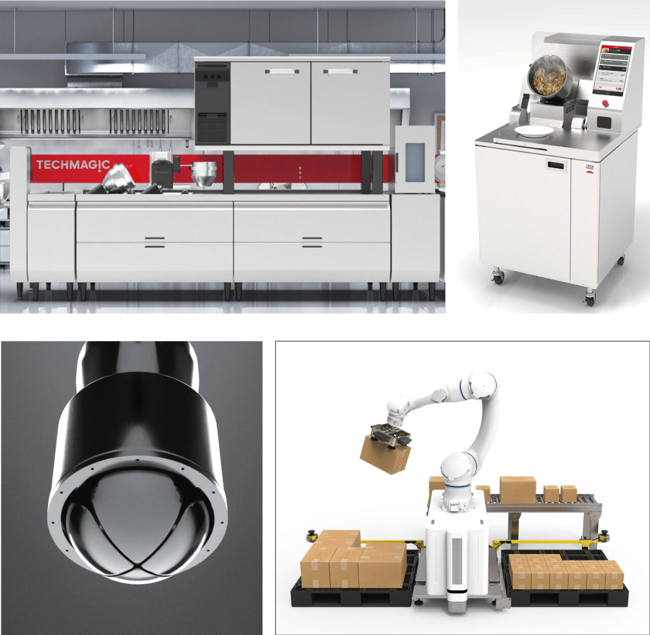 厨房の未来を変えるTechMagic社の調理ロボット群。現在、同社の主力である『I-Robo 2』(画像右上)は、一風堂や大阪王将といった全国チェーンに導入され、プロの味を完全再現した調理プログラムで、味の品質そのままに厨房効率化に寄与している。