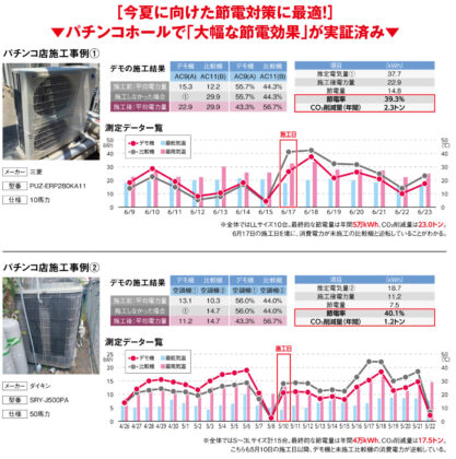 一昨年にホール大手のダイナムが九州エリア48店舗で正式採用したのを皮切りに、その節電効果を証明。その後、同社の関東、東海、中国、四国での各エリアで導入が進み、現在も継続的な発注を受けるなど高い信頼を獲得している。また他ホール企業にもその効果の高さが知られ導入店が増加中だ。