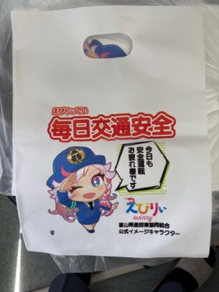富山県遊協の公式キャラクター「えびりぃ」のオリジナルお菓子を運転ドライバーに配布した。