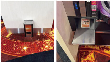 現在は加熱式タバコの回収装置としてリプレースする案件が急増中。新たにスマート遊技機専用島で「1本の回収ライン」を実現した装置(写真)も徐々に導入ホールが増えている。