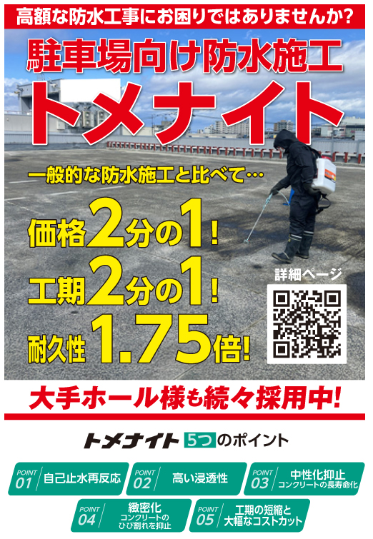 現在の主力は駐車場向け防水施工『トメナイト』だが、徐々に加熱式フロアにおける吸殻回収装置のリプレース案件も増加。再びアメニックスの存在感は高まりつつある。