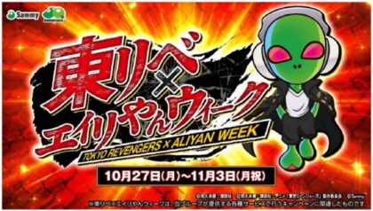 サミーは10月22日、同社の人気キャラクター「エイリやん」の誕生日(11月1日)を記念し、コラボキャンペーン『東リベ×エイリやんウィーク』を10月27日(月)から11月3日(月・祝)まで実施すると発表した。