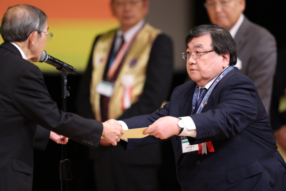 感謝状を受領する伊坂重憲理事長(右)。
