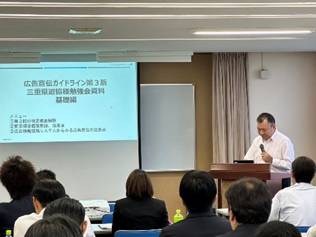 三重県遊協(権田清理事長)は10月23日、津市内で広告宣伝担当者講習会を開催。当日は組合加盟する各法人の広告宣伝担当者(店長含む)が35名受講し、広告宣伝ガイドラインへの理解を深めた。
