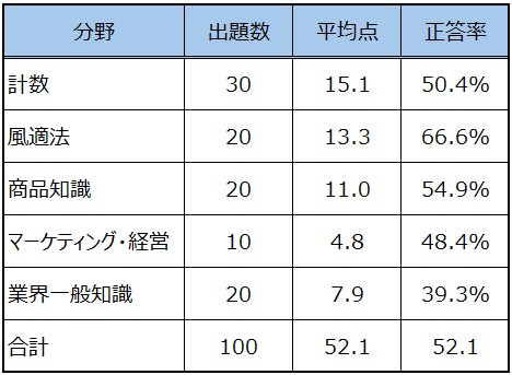 第18回検定(2024年3月~10月)は受検企業数69社、711人(店長クラス321人、主任クラス203人、一般社員159人、本部社員・役職者28人)が受検。平均点は52.1点で、最も正答率が高かったのは「風適法」分野で66.6%、正答率が最も低かったのは「業界一般知識」分野で39.3%だった。G&Eでは、基礎分野である「計数・風適法・商品知識」において70%以上の正答率が望ましいとしている。