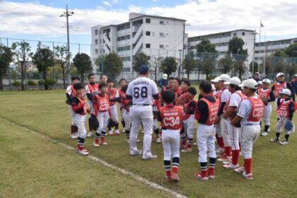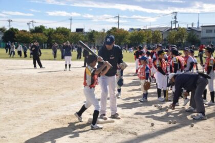 区内の小学生軟式野球チームを招待し、14チーム約170名が参加。元スワローズの五十嵐貴章氏、花田真人氏、中尾敏浩氏、山中浩史氏の4名が約3時間にわたり、準備運動から走塁、キャッチボール、ピッチングやバッティングなどを実技指導した。