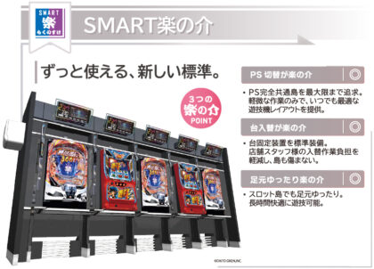 埼玉県内で4店舗を展開する産経商事㈱は、旗艦店《ウイングキャッスル》(さいたま市西区・台数936台)の年内グランドリニューアルに向け、スマート遊技機PS完全共通島『SMART楽の介』を新設。設置は4島・160台に及ぶ。