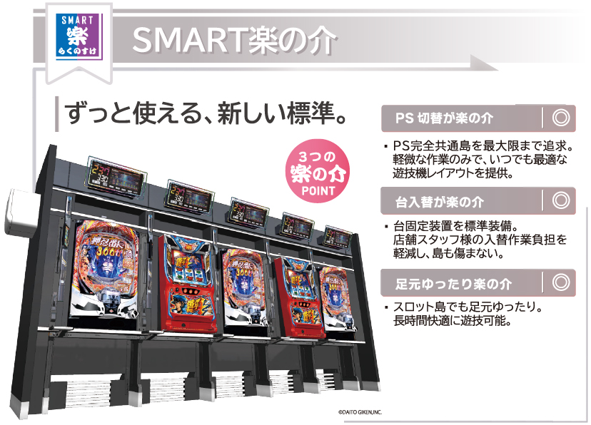 一方、P⇔S切り替え時の工事を一切不要としたのが『SMART楽の介』だ。PS設置時の高さ・構造を共通化する事で、従来必要だった工事を解消。さらに、S島への切り替え時に椅子を後方へ移動させる「セットバック」工事も不要とした。加えて、業界初の「台固定装置」を内蔵し、遊技機設置時のビス止め作業を省略。専用工具による簡易作業で、スタッフのみでも高品質な設置を可能にした。