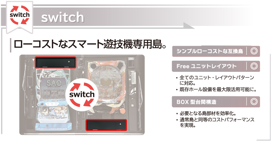 パチスロ市場の好転を背景に、同社が2023年6月、他社に先駆けて販売を開始したのが、スマート遊技機PS互換島『switch』だ。P⇔Sの切り替えを簡単かつスピーディに実現する構造を採用し、ユニットや紙幣搬送の工事も不要で、既存設備を最大限に活用できる「Freeユニットレイアウト」を実現。さらに、紙幣搬送対応(両面島)タイプで575㎜という業界最小クラスの島幅を達成し、通路スペースのゆとりを確保した。