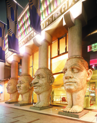 経営する「道頓堀ホテル」の玄関。1989年、関西国際空港オープンに向けて、世界のお客様に来ていただきたいという想いを込めて建造。4体像は東洋人、西洋人、黒人、アラブ人と世界の4大民族を表現している。
