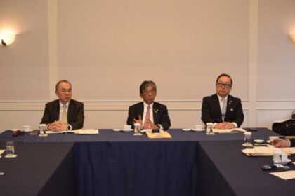 記者会見に臨んだ左から太田専務理事、阿部理事長、千原副理事長。