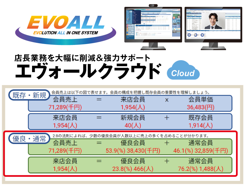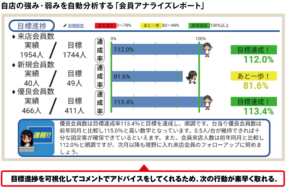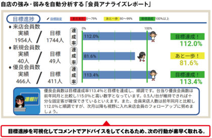 『エヴォールクラウド』に備わる会員アナライズレポート機能は、自店の会員データから、新規会員獲得数、優良会員数、女性比率など様々な項目で分析可能。全国データから自店と同規模店舗との比較もでき、その差から自店の強み、弱みを分析したレポートを作成する機能だ。