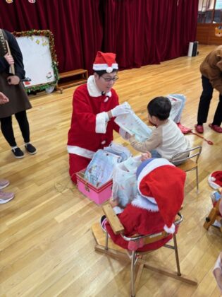 富山県遊技業協同組合青年部会は12月19日、富山市の児童発達支援センター《恵光学園》で開催されたクリスマス会に参加し、クリスマスプレゼントとして保育用具(椅子8基)と文房具・お菓子セット(40セット)を寄贈した。