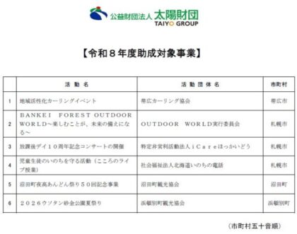 なお、同財団では2月下旬から3月上旬にかけて、札幌市内で助成対象事業目録の贈呈式を開催する予定。