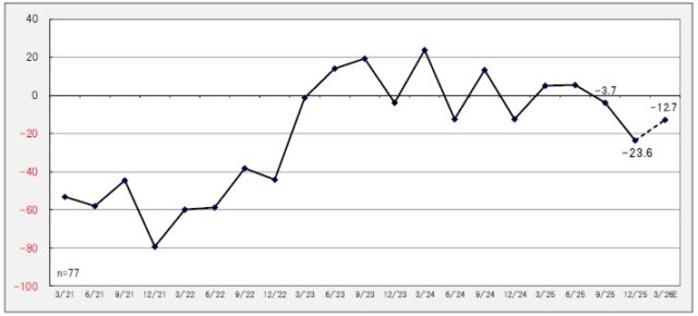 景気動向指数(DI値)は、事業者に業況の良し悪しを三択で尋ね、「良い」の回答構成比から「悪い」の回答構成比を差し引いて算出される指数だ。今回の調査における全般的業況DI値は、前回比19.9ポイント低下の▲23.6ポイントとなり、大幅に悪化した。3カ月後の見通しについては▲12.7ポイントまで回復する数値を指しているものの、依然として厳しい状況が続く。