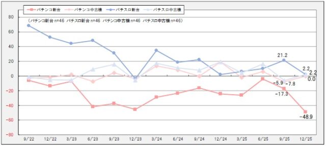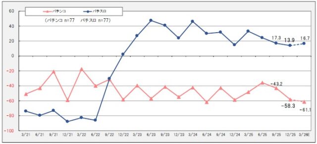 稼動状況に目を向けると、パチンコは▲58.3ポイント(前回比15.1ポイント低下)と低迷。3カ月後も▲61.1ポイントとさらに悪化する見通しだ。対するパチスロは13.9ポイント(同3.4ポイント低下)とプラス圏を維持しており、3カ月後は16.7ポイントへの上昇を見込む。