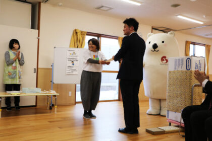 同日、同グループ取締役統括管理本部長の澤田勇樹氏が、つくし学園の園長・柿本尚子氏へ寄贈品を手渡した。寄贈品は絵本「そらの100かいだてのいえ」および折りたたみピクニックテーブルで、合計金額は52,800円(税込)。