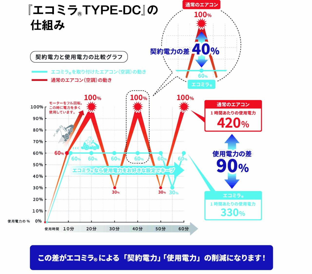 「世の中にある省エネシステムの多くは、強制的にエアコンを止めて電力を抑える方式が主流です。対して『エコミラ』は、特許取得済みのインバーター制御技術により、エアコンを一切止めずにモーターの回転数を最適化します。これにより、お客様の快適な体感温度を維持したまま大幅な消費電力の削減が可能になり、空調機器の長寿命化にもつながるのです」。