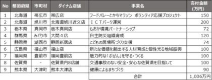 今回の寄付先は北海道帯広市、同旭川市、栃木県真岡市、群馬県みどり市、静岡県湖西市、広島県福山市、福岡県豊前市、佐賀県、熊本県大津町。