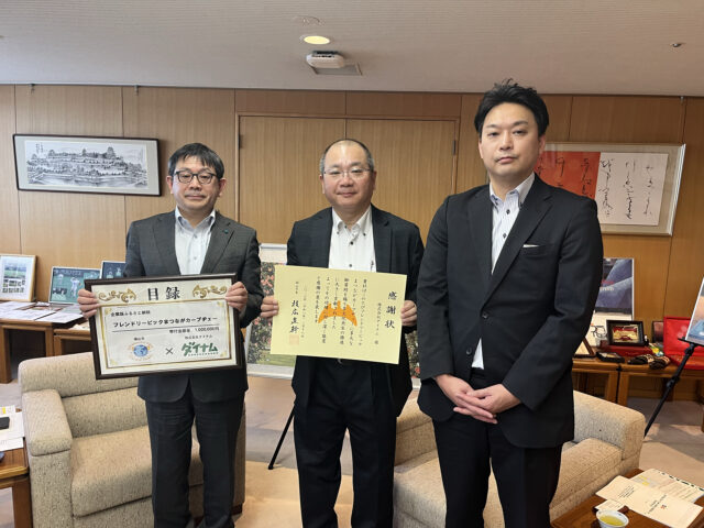 一部自治体で寄付目録の贈呈式も行われ、各自治体関係者とダイナム店舗責任者が出席した。