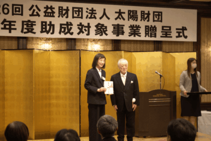 北海道でパチンコ店《パーラー太陽》を展開する太陽グループの関係法人である公益財団法人太陽財団(東原俊郎理事長)は3月12日、札幌市中央区の札幌グランドホテルで「令和8年度助成対象事業贈呈式」を開催し、同年度の助成対象に選定した6事業へ助成金を贈呈した。