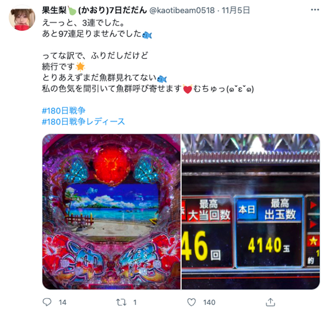 牙狼の遊タイムを狙うなど、勝利への貪欲な姿勢は衰えていない果生梨。その姿をきっと勝利の女神は見てくれているはず。