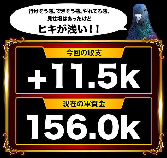 今回は台選びでバチっと正解を出せずヒキでなんとかしたことでちょいプラで終われました。見せ場を結果に結びつけられずに、終わってしまったのが残念でした。まさかあんなことになるとは……!