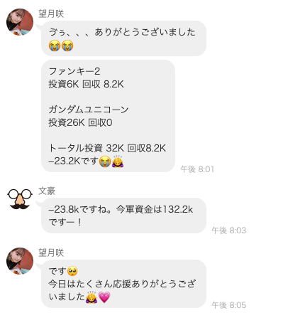 望月咲です! 徐々に軍資金が減ってきてる中、なんとかここでプラスに持ち込みたい! プラス100k以上を目標に、先輩たちをぎゃふんと言わせるぞー└(。・`□´・。)┘