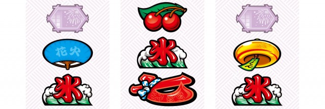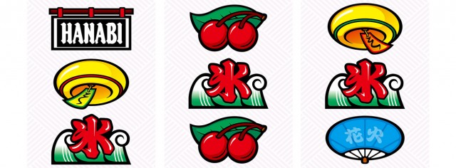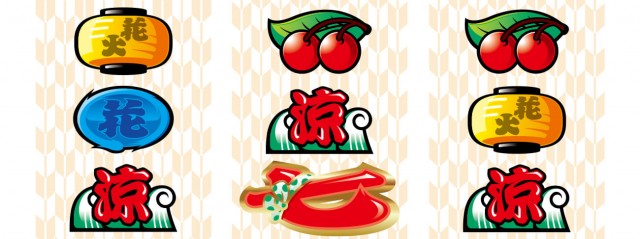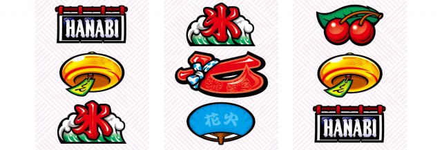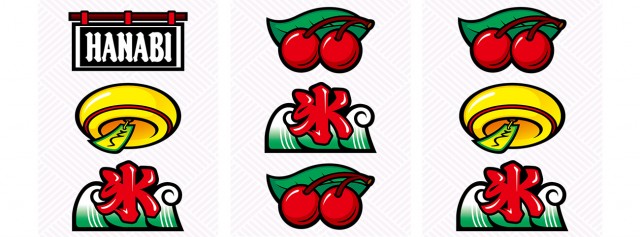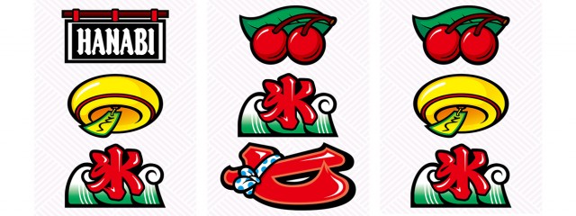 いぶし銀よなぁ。これぞ江戸って感じ。わかりますか? 風鈴、チェリー、氷、暖簾が2個ずつで、その全てを締めるように1個の赤七が下段にキュッと収まってる、この感じ! これから今まさに夜空を彩らんとする花火が筒から発射される、その瞬間。私にはそう見えます。厳密に言えば氷の小山ではないかもしれませんが、暖簾=氷の代用絵柄だから私的にはOK。むしろコレしかねぇだろって感じです。これがね、4~5号機のハナビは中段に赤七が止まるとREG確じゃねぇのかオイっていうぐらいBIGが出てこなかったんですよ。だから、この形になるとBIGの予感がする。だから嬉しい。だから美しい。そういう面もあると思います。これが新ハナビになると、