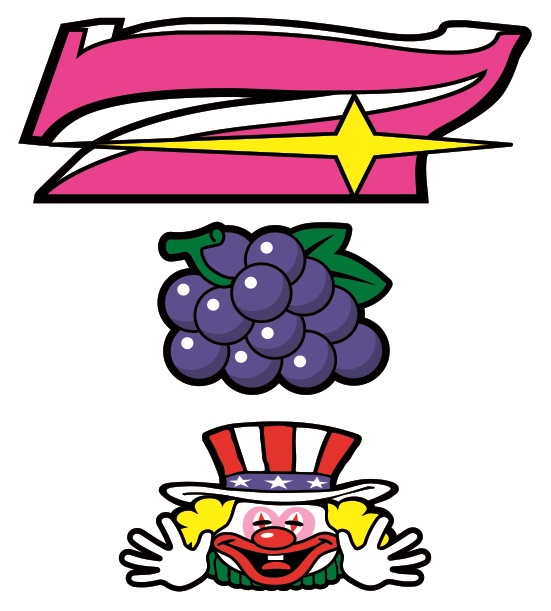 上段赤7はピエロ・ブドウ・ボーナス。右リールはボーナス付近を避けて、ピエロがテンパイしたら左リールでピエロをフォローしましょう。まあ、大体ブドウですけどね。