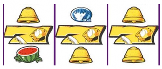 古すぎて画像が荒いよチクショウッ!!! でもニュアンスは伝わるでしょ? この狙わなくてもリールの裏側からスベッて来てでも揃いそうな感じ! オモチャっぽい7だよなぁ。『エヴァ』と同じ黄色の7でも、揃いやすさの印象では対極だもんね。