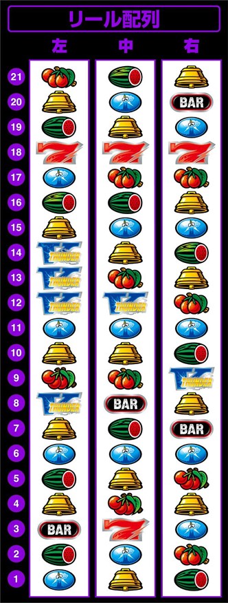 これなんだよねぇ。違いは一目瞭然、左リールの上段にベルがあるかどうか。ベルがあるとさ、ちょっと出目的に綺麗すぎるというか。人間味があるというか。出目がちょっと暖かいんだよね。で、ベルがないと一気に機械的になるというか。シンプルでチープだけど、そこがパチスロっぽいというか。無慈悲な雷神からの一撃っていう感じがするというか。