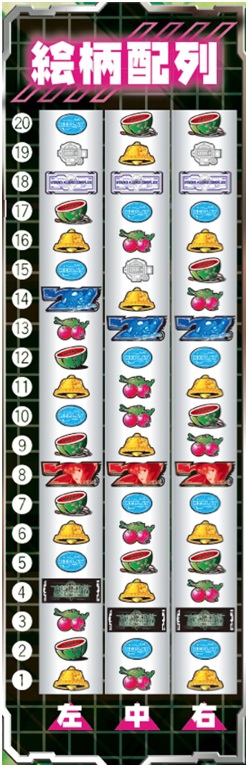 配列はまあ、別にって感じなんだけどね。AT中に中押しでBAR狙いするのが好きだったなぁ。中段BARでチャンス目or強チェだっけ? あれ弱チェもあったっけ? ショートロック絡みでアツかったのは覚えてる。