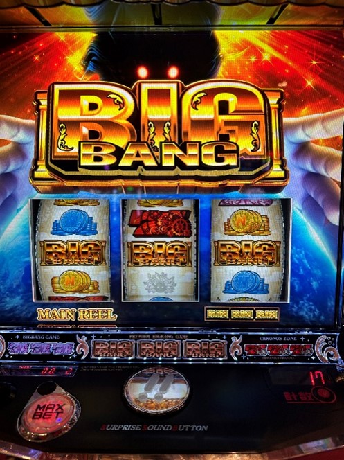 揃えた写真だけはバッチリ納めたけど。で、100G間で赤まで上げてジャッジで成功して、無事に神さま炎撫へ。3連ぐらい消化してた時だっけなぁ? もう1回、BIGBANG絵柄が揃ったんですよね。これはマジで写真がない。だって、演出なんて何も起きずに、スッと揃っちゃったから。神さま炎撫は11連で終了。追加のガチャはなし。通常ATは180Gで何事もなく終わった後、プレミアムBIGBANG GAMEチャレンジで7を揃えて、BIGBANGステージへ。また赤まで上げて、無事にジャッジ成功して、神さま炎撫を11連させて、ガチャも2個ストックして…正直、もう差枚数完走だと思うじゃん?