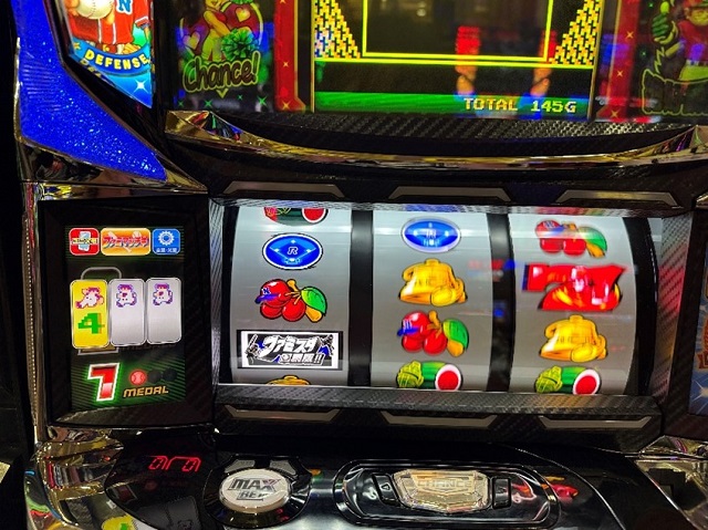 4コマスベリは実戦上、赤7BIGの1確目です(払い出しはナシ。リプレイでもなかった)。成立後にどれだけ回しても停止しないことから、おそらくリプレイ頭の1枚役(BARの下にあるリプレイとは絵柄が違う)との同時当選時のみ停止する出目だと思います。僕はこの出目が止まるまでは「リーチ目役=ベルこぼし1枚役と同じ役構成で、ベルこぼし1枚役と同様に取りこぼしがない」と思っていました。でも違うみたいですね。そういうタイプのリーチ目役もあるけど、単独タイプ(もしくは複数で同時成立だけど取りこぼす可能性がある)の1枚役も存在すると思います。制御がそうモノ語っています。