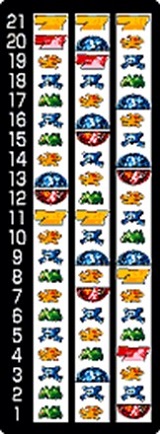 これが4号機ワードラの配列です。CT中は左1stで12,13番の塊を狙うと15枚が獲得できるっていう仕様でした。これをどうするんだっていう。押し順+各リールのデカチリ狙いっていう線も考えたけど、それだと通常時の小役狙いが左1stデカチリ狙い、変則押しも第3はデカチリ狙い必須になっちゃう。ユニバさんはそういうのやらないと思うんだよなぁ。出目が死んじゃうじゃん。やっぱり左リールに黄7と赤7狙いたいじゃん? だからデカチリは枚数獲得じゃなくて、リーチ目とか小役ハズレ目として使うと思うのよ。左リールにデカチリ止まったら1確、他の停止型は取りこぼしても代用で揃う〇枚役みたいな感じでさ。