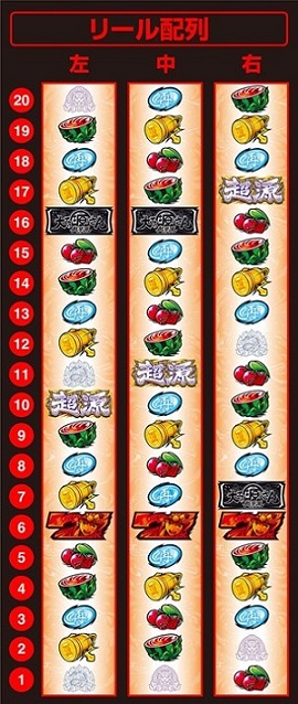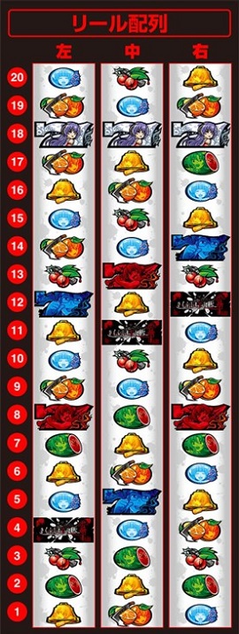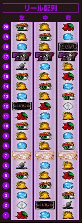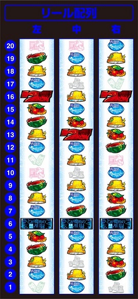 中リールのリ・赤7・リと右リールのリ・BAR・赤7がいいね。これは揃えるために作られた配列になってると思う。仕様なんにも知らんけど、AT中とか特化ゾーン中とかに揃えて気持ち良いタイミングがあるんじゃないかな?