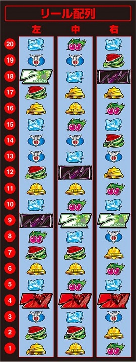 この青いブランク?みたいなのが絶妙にエモいよねぇ。エモいって言葉はこの絵柄のために生まれたまであるぐらいエモい。いや、この台は絶対に面白いわ。スイカもイイ感じに蜷局っちゃってるし。あれ、スイカの絵柄が2種類だな。変則ライン機かな? 左リールにチェリーが1個しかないからBAR狙い専用機かとも思ったけど、もしかしたら代用が効くのかも?? ふーむ気になるねぇ。コイツはマジで導入が楽しみ。