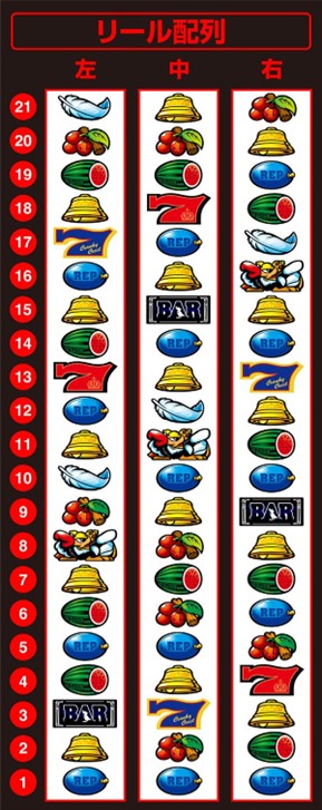 うん。でもねぇ、なんかもう1スパイス欲しくないですか? 変則押しはまだやらないとして、左リールで「ここだ!」っていう狙い目が欲しい。ちなみに配列上では左リールの上段にチェリーを押すとスイカを取りこぼししてしまうので、小役狙いの際は注意が必要です。あと、順押しの場合は右リールのスイカが要目押しになります。ここ大事。