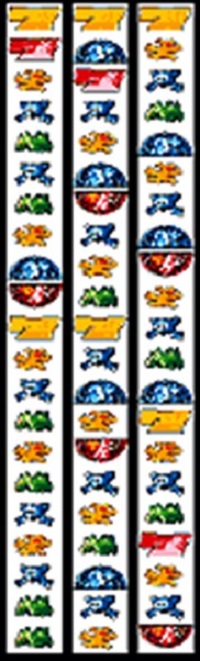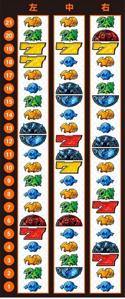 うわぁ、なんか絵柄が全然違う(笑) 7は若干シェイプになってる? 小役の絵柄がリアルな感じになってますね。配列もワードラの匂いはバリバリにするけど、かなり変更されてるなぁ。7の2連は同色になってるし、その代わり単独7が赤7になってる。中リールの7・青・7の関係が、赤7が上に変更されてる。個人的にものすごく気になるのが、右リールにある2つの赤7の距離が短いのよね。こういうのってユニバ系の機種ではものすごく珍しい。なにか意図を感じるなぁ。これは打ってみないとわからないなぁ。何故なんだろうなぁ。
